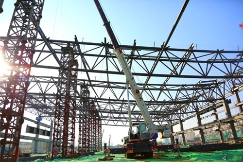 四號展館屋面桁架吊裝在進(jìn)行中。