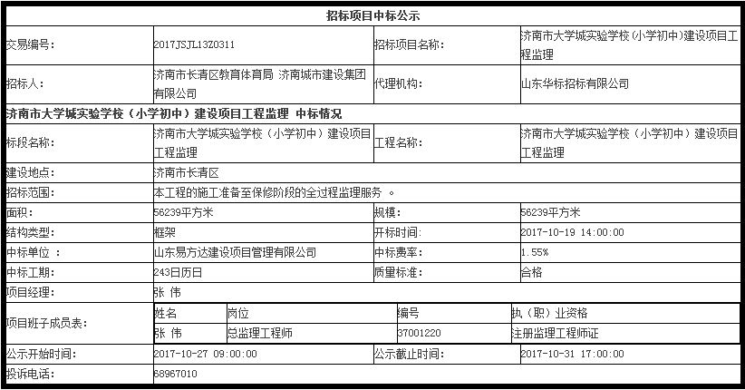 濟(jì)南市大學(xué)城實(shí)驗(yàn)學(xué)校(小學(xué)初中)建設(shè)項(xiàng)目工程監(jiān)理中標(biāo)公示