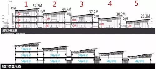 在施工現場,五個展館的整體結構已經非常清晰,從南至北兩座一層展館,兩座雙層展館,一座三層展館錯落有致地排列著,其中整體高度最高的為最北端的1號展館,三層總高度52.2米,單層最高的為4號展館,高度30.2米(凈高度19米),適合舉辦大型機械類展會。