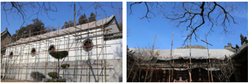 目前,所有古建的勘查檢修工作已經(jīng)完成,年久失修的房頂苫背、望板等已全被撤下,色澤與功能都已陳舊建筑油漆也被逐層敲除,臨時(shí)撤下的古磚古瓦、飛檐檁條等都被整齊編號(hào)入庫(kù),以作后用。