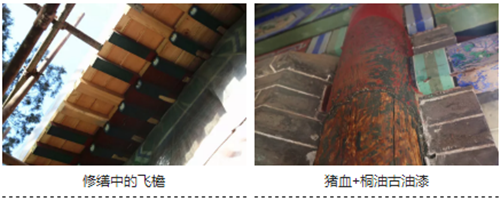 華陽(yáng)宮現(xiàn)存古建多為明清建筑,建筑油漆都是采用“豬血+桐油”的古法油漆,此次修繕過(guò)程中,涂刷的新油漆也全部采用該種古法工藝。