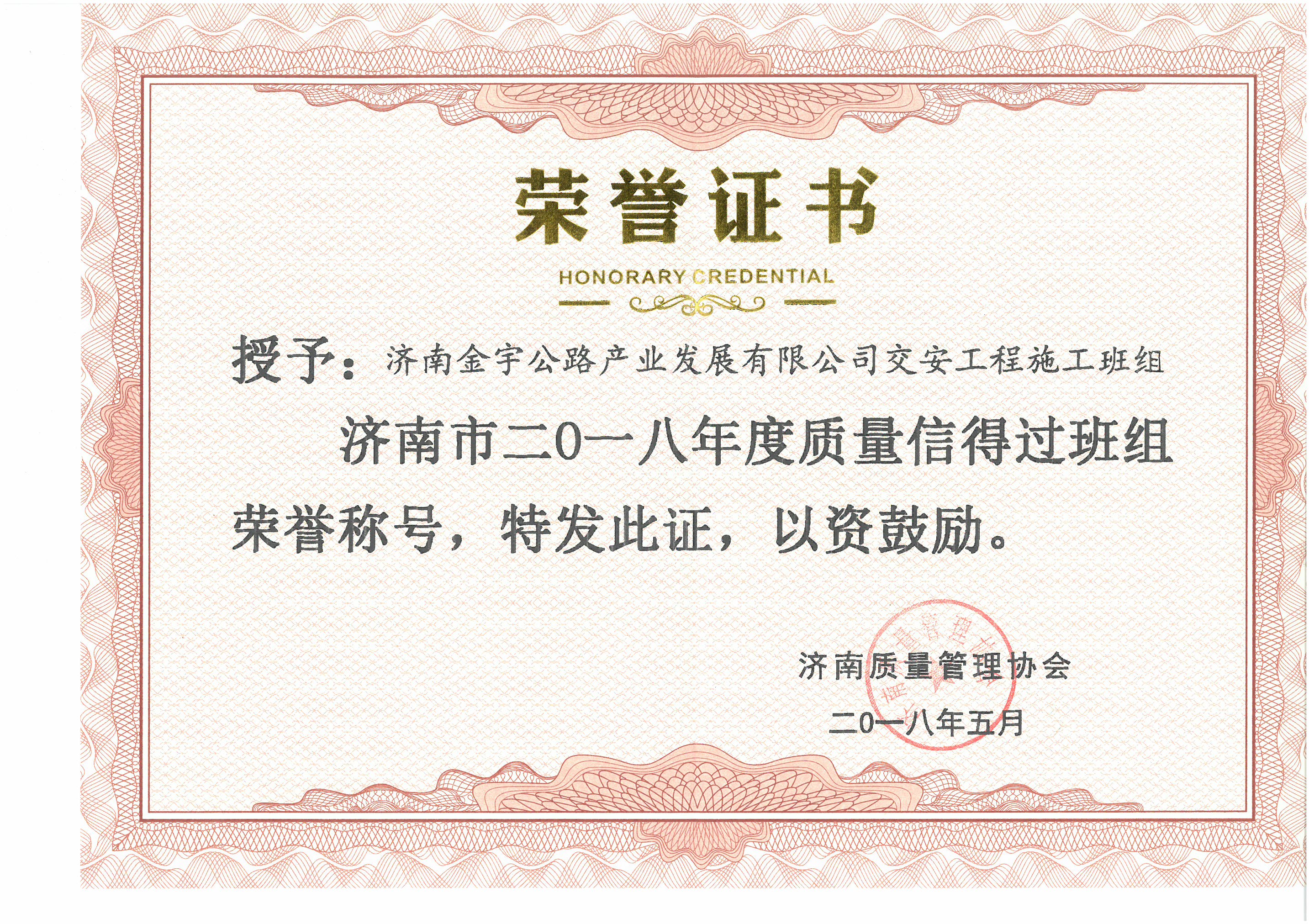 濟南金宇公路產業發展有限公司交安工程施工班組榮獲濟南市2018年度質量信得過班組榮譽稱號;公司憑借《提高防眩網安裝一次驗收合格率》、《提高標志版面安裝平整度》兩項課題榮獲“濟南市2018年度質量管理成果一等獎”;《提高公路聲屏障線性順直度合格率》課題榮獲“濟南市2018年度質量管理成果二等獎”;《降低熱熔標線逆反射系數衰減率》課題榮獲“濟南市2018年度質量管理成果三等獎”;授予李玉寶、李景軍、劉莉三名同志2018年濟南市優秀質量管理工作者稱號。