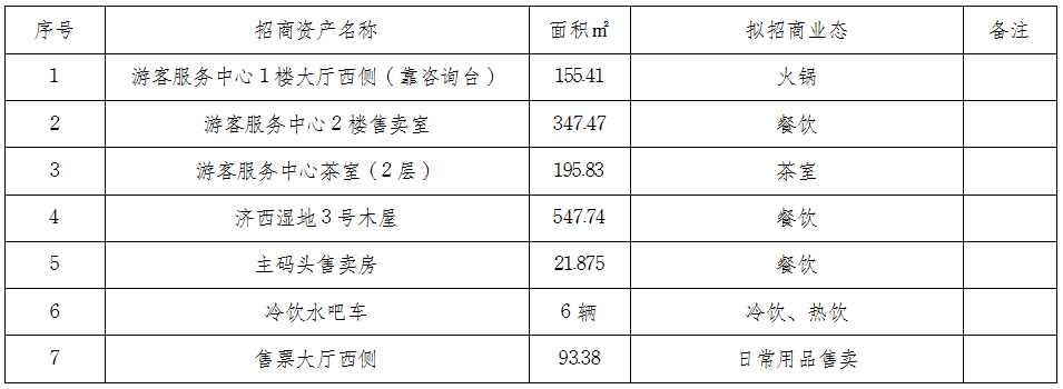 山東濟西國家濕地開園在即,為豐富園區業態,現就園區可經營性資產進行公開招商,資產面積及業態規劃如下: