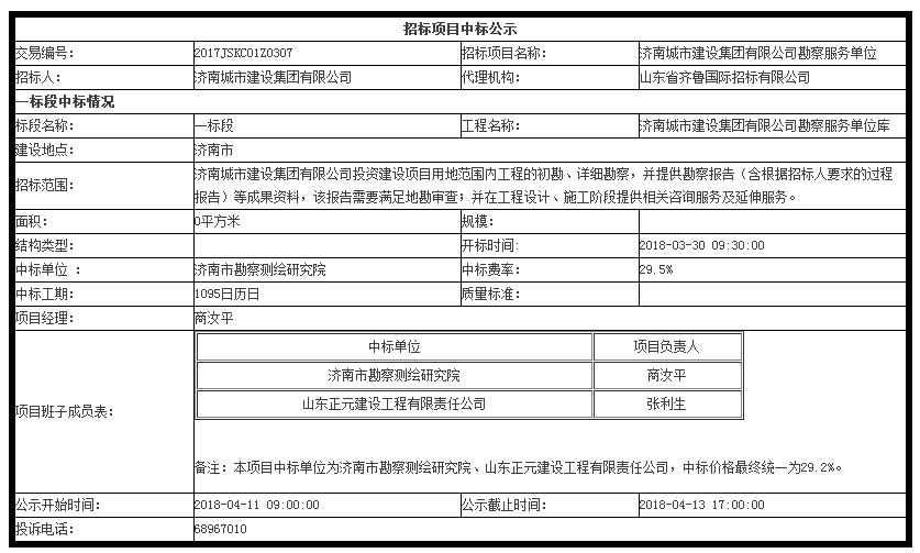 濟(jì)南城市建設(shè)集團(tuán)有限公司勘察服務(wù)單位中標(biāo)公示