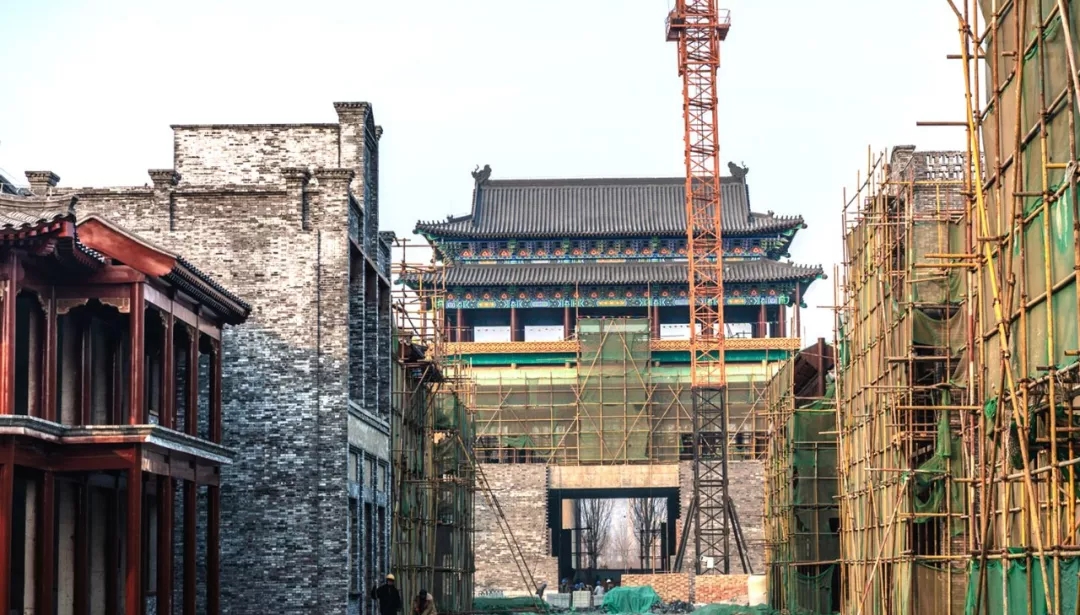 項目所有建筑中,最具標(biāo)志性的當(dāng)屬城門樓,同時,這也是項目內(nèi)工程量最大、工期最長的單體建筑。其中城墻高度為8.7米,城門樓最頂端高度為29.5米。僅城門樓施工使用的鋼管就已達(dá)20萬米,占整個項目鋼管消耗量的近一半,從基礎(chǔ)施工到主體完工,耗時近4個月。城門樓的彩繪部分采用的是旋子彩繪形式,用或圓潤飽滿、或流暢柔韌的各色線條旋轉(zhuǎn)盤結(jié)而成,最大的特點是在藻頭內(nèi)使用了帶卷渦紋的花瓣,旋子常用于殿式彩畫,既素雅又華美。