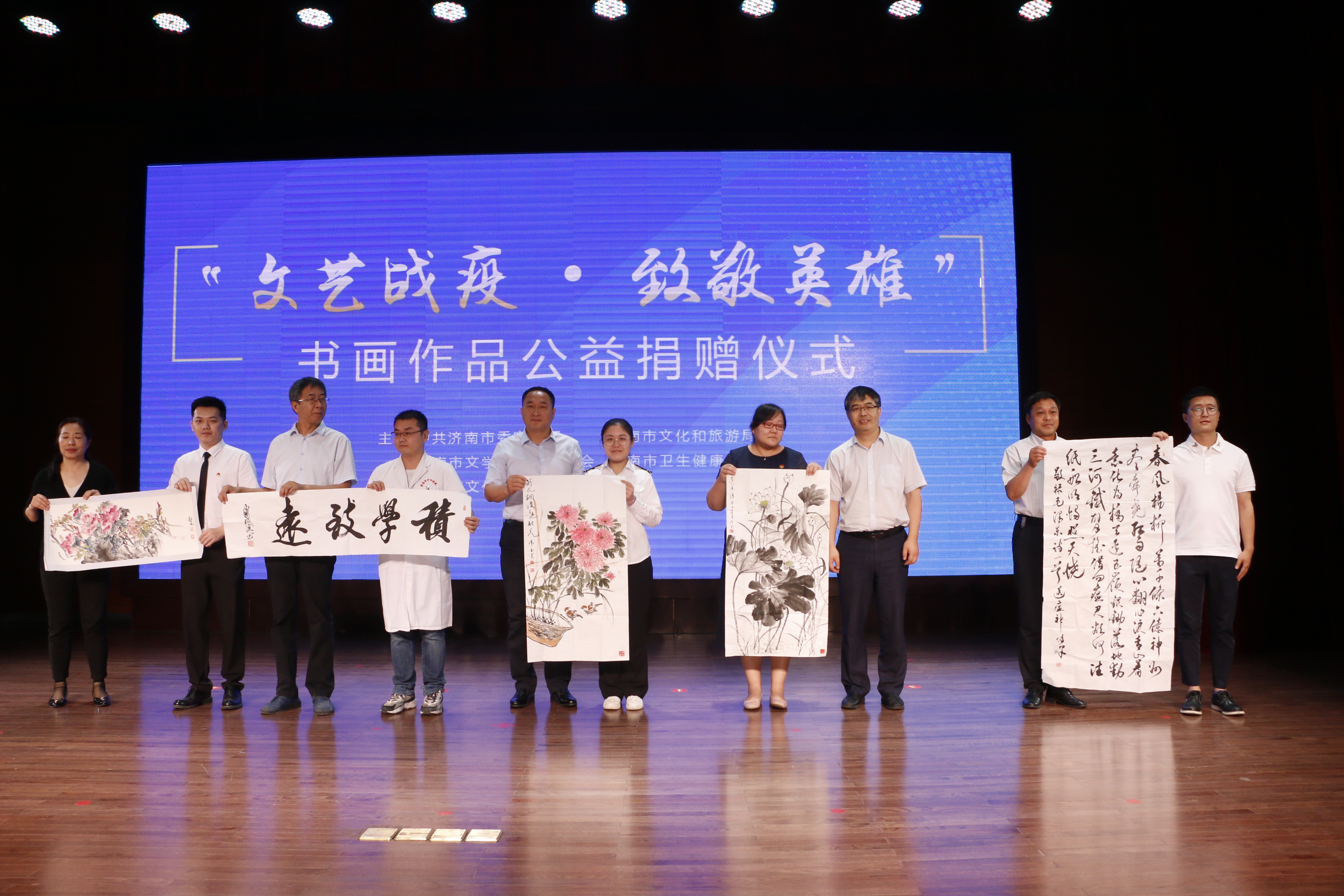 為進(jìn)一步加強(qiáng)疫情防控宣傳工作,充分發(fā)揮濟(jì)南市文藝戰(zhàn)線優(yōu)勢(shì)作用,用文藝的形式向抗擊疫情一線英雄致敬,6月9日,由市委宣傳部、市文化和旅游局、市文學(xué)藝術(shù)界聯(lián)合會(huì)、市衛(wèi)生健康委員會(huì)主辦,市文化館承辦的“文藝戰(zhàn)疫·致敬英雄”濟(jì)南市書畫作品公益捐贈(zèng)儀式在市文化館多功能廳舉行。市委宣傳部、市文化和旅游局、市文聯(lián)、市衛(wèi)健委等主承辦單位相關(guān)負(fù)責(zé)同志以及書畫作品捐贈(zèng)藝術(shù)家代表、援鄂醫(yī)護(hù)工作者等抗擊疫情一線的各界代表共計(jì)80余人參加活動(dòng)。