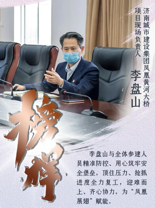 陽春三月,兩岸新綠。鳳凰黃河大橋施工現場,各施工區域熱火朝天、作業正忙。自項目全面復工以來,1000多名工人日夜奮戰一線,在做好疫情防控工作基礎上,項目建設各項工作全速推進。作為濟南城市建設集團鳳凰黃河大橋項目現場負責人,李盤山與全體參建人員精準防控、用心筑牢安全堡壘,頂住壓力、搶抓進度全力復工,迎難而上、齊心協力,為“鳳凰展翅”賦能。