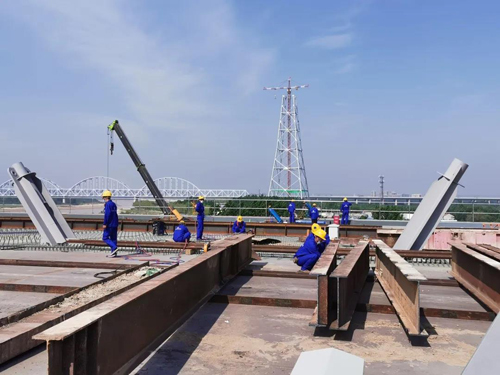 目前,各區域施工全面展開,項目參建人數近500人,主橋鋼箱梁頂推施工采取三班倒24小時飽和施工,經過全體人員199天的連續奮戰,4月30日項目成功將北跨280米鋼箱梁平移980米橫跨黃河,完成鋼箱梁黃河北岸落梁。420米中跨鋼箱梁正在吊裝頂推作業,已累計頂推260米。