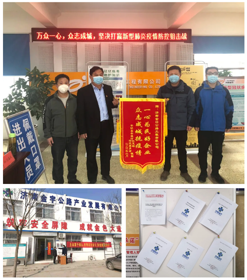 疫情來(lái)勢(shì)洶洶,在嚴(yán)峻條件下金曰公司、金宇公司等項(xiàng)目部主動(dòng)出擊,儲(chǔ)備防疫物資,制作宣傳標(biāo)語(yǔ),協(xié)調(diào)人員調(diào)度,一手抓防疫,一手抓復(fù)工,堅(jiān)持“兩手抓”,奪取“雙勝利”。金曰公司項(xiàng)目部為沿線的8個(gè)村莊和濟(jì)菏高速收費(fèi)站捐獻(xiàn)了生活必需品、防疫物資,協(xié)助當(dāng)?shù)劓?zhèn)政府開展疫情防控工作,積極承擔(dān)社會(huì)責(zé)任。