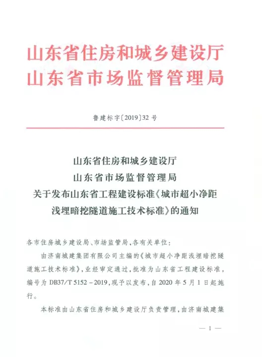 近日,山東省住房和城鄉建設廳與山東省市場監督管理局聯合下發魯建標字[2019]32號文《關于發布山東省工程建設標準〈城市超小凈距淺埋暗挖隧道施工技術標準〉的通知》,宣布由城建集團主編的該標準業經審定通過,批準為山東省工程建設標準,編號為DB37/T 5152-2019,予以發布,自2020年5月1日起施行。這是城建集團主編并已發布的第九部山東省工程建設標準,對省內隧道施工起到了一定的規范指導作用。