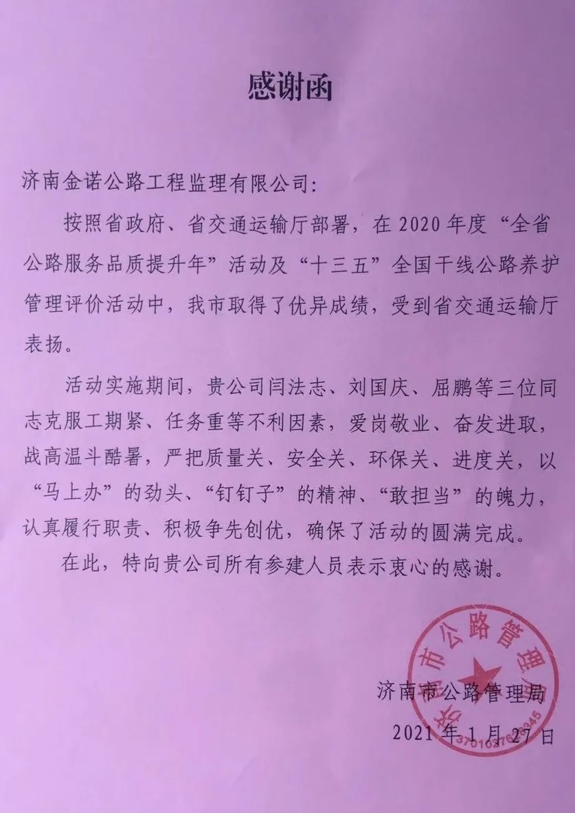 近日,濟南市公路管理局向金諾公司發(fā)來了《感謝函》,向金諾公司所有參建人員在2020年度“全省公路服務(wù)品質(zhì)提升年”活動及“十三五”全國干線公路養(yǎng)護管理評價活動中,認真履行職責(zé)、積極爭先創(chuàng)優(yōu)的工作作風(fēng)表示感謝。