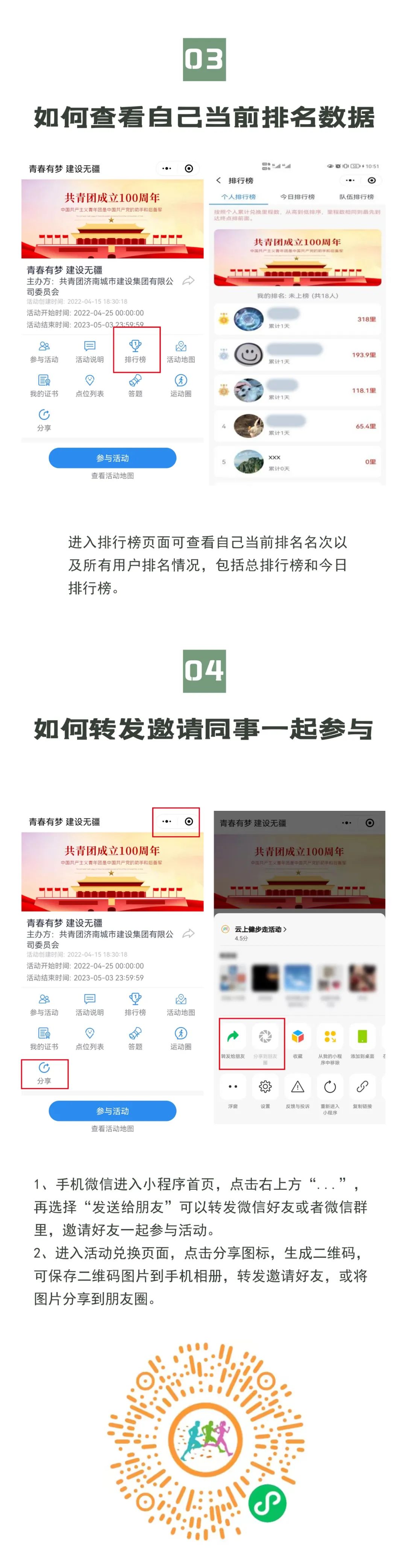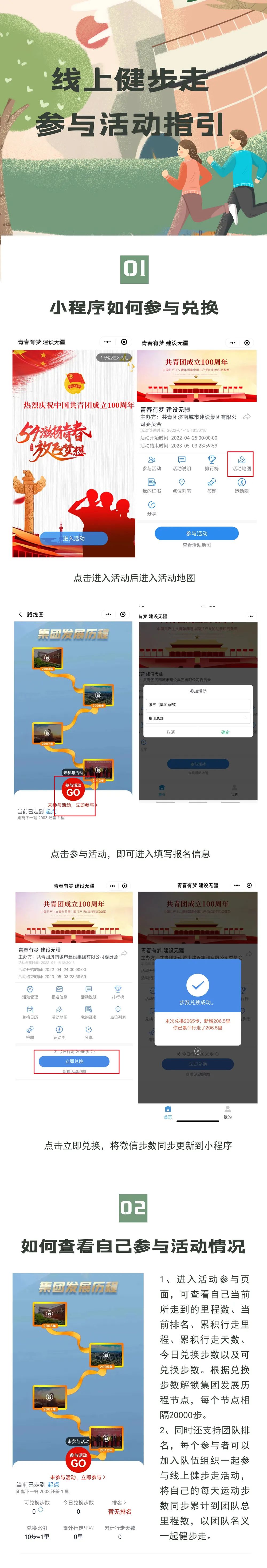為慶祝建團(tuán)100周年,開展好“百年崢嶸、初心不改、青春與共、砥礪前行”主題教育實(shí)踐活動(dòng),展現(xiàn)集團(tuán)自成立以來的光輝歷程,賡續(xù)集團(tuán)紅色精神、凝聚集團(tuán)奮進(jìn)力量,不斷增強(qiáng)廣大職工的身體素質(zhì)和健康水平,不斷提高集團(tuán)的凝聚力和向心力。由共青團(tuán)濟(jì)南城市建設(shè)集團(tuán)有限公司委員會(huì)主辦,共青團(tuán)濟(jì)南金曰公路工程有限公司委員會(huì)、濟(jì)南新城文化傳媒有限公司承辦的“青春有夢 建設(shè)無疆”——職工線上健步走活動(dòng)將于今晚零點(diǎn)正式上線,活動(dòng)時(shí)間為2022年4月25日——5月3日(共十天)。