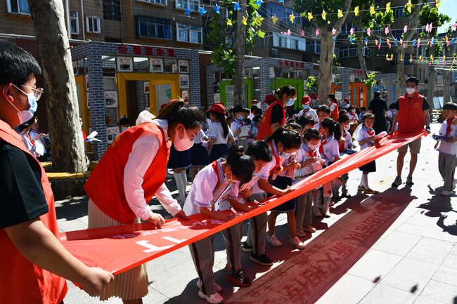 活動(dòng)最后,小朋友們?cè)?ldquo;以團(tuán)帶隊(duì) 薪火相傳 安全‘童 ’行 ”的條幅上簽上自己的名字,胸帶少先隊(duì)徽,一筆一畫(huà)的認(rèn)真書(shū)寫(xiě),鮮艷的紅色條幅映紅了孩子們的臉龐,在孩子心中播種下美好的種子。