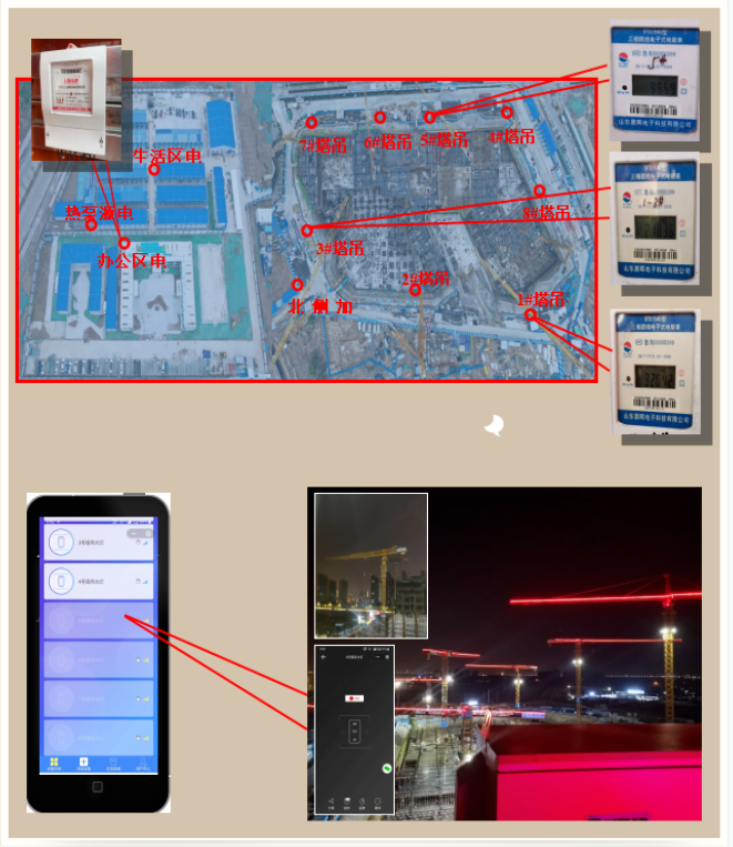 在房建類(lèi)項(xiàng)目建設(shè)中,通過(guò)用電分區(qū)計(jì)量,將施工用電,辦公用電,生活用電均分開(kāi)計(jì)量,現(xiàn)場(chǎng)8臺(tái)塔吊,均單獨(dú)計(jì)量,項(xiàng)目安排專(zhuān)人每月底抄表,做好用電臺(tái)賬,并統(tǒng)計(jì)分析,糾偏查因。同時(shí)通過(guò)項(xiàng)目部塔吊大燈遠(yuǎn)程智能控制系統(tǒng),保證施工現(xiàn)場(chǎng)無(wú)人施工時(shí)能第一時(shí)間利用APP使塔吊鏑燈,節(jié)約能源。