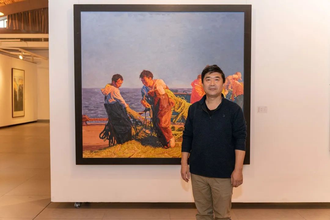 像李兆虬一樣,濟南市職工文化事業發展中心副研究員吳愛民的作品也是聚焦一線勞動者。作品《海上奏鳴曲》創作背景源自吳愛民到石島采風時,清晨在碼頭看到的漁民出海歸來時的豐收景象。