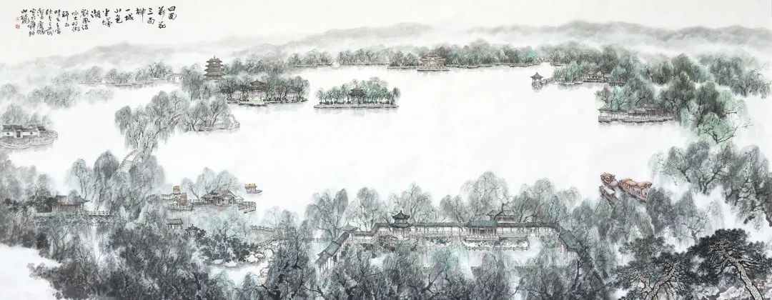 “大明湖是濟南符號的代表之一,也承載了濟南過去的歷史,更是濟南從‘大明湖時代’向‘黃河時代’跨越轉變的見證”,李慶杰說:“在創作中保留了大明湖原始景色,同時融入大明湖新湖擴建后的新地標,將傳統與現代融合,既體現濟南厚重的歷史也展現了濟南融入新時代發展的浪潮。”