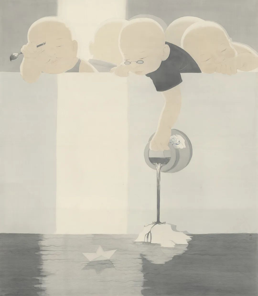 作品《夏》以泉文化為題,畫中的五個孩童,以孩童的視角展示生命里純粹的感受。畫面中,泉娃預示著生命之始,泉水預示著生命之源。同時,毛筆與墨汁展示著傳統和文化,紙船映射著遠方與航向,光綻放著溫暖與希望。畫中調子暖灰色,畫面祥和安寧,作品從中也映射出,在日新月異的泉城濟南,在人們的不斷改革、創新和發展下,孩子們才能夠有了更加安定祥和的空間與環境。
