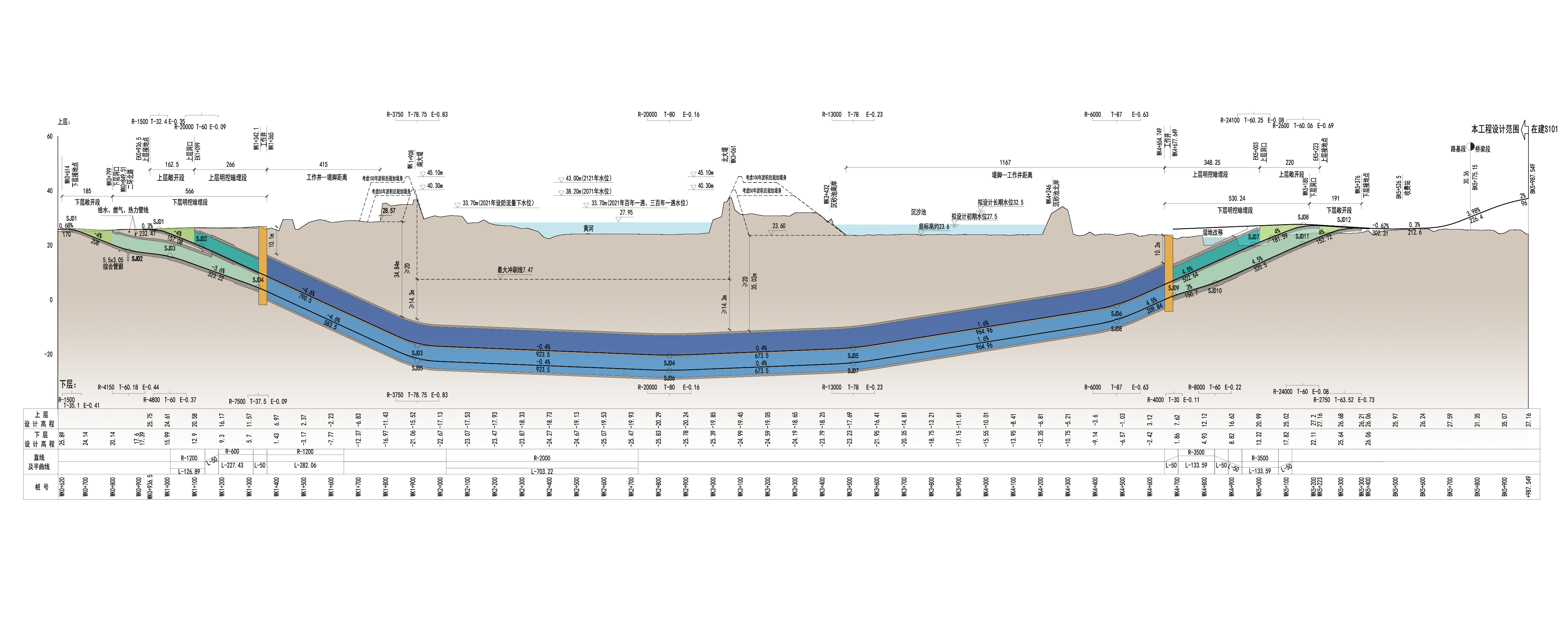 濟南黃河黃崗路隧道定位為小客專用通道,并兼顧消防救援、公交通行需求。項目凈空高度達到了4.2米,可以滿足規范中所有不超限車輛正常通行,也可滿足消防、管理及救援的要求。施工過程中,隧道需穿越鵲山水庫沉砂池的一級水源保護,盾構施工擬采用環保漿液,同時根據土層滲透性情況復核漿液的輻射范圍,確保盾構穿越時漿液不串入沉砂池,實現對一級水源保護地的無害化穿越。
