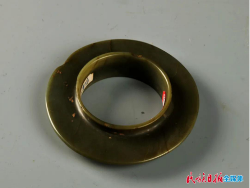 三聯(lián)璧是該館的重要藏品之一,這件器物屬于透閃石玉,整體呈扇面狀,由三件玉片連接而成,每一片都兩側(cè)對稱,兩端鉆孔,孔一面大一面小,呈喇叭狀,采用單面鉆孔法。此套三聯(lián)璧雖加工簡單,但琢工端莊大氣、拙樸豪放,它在最初以配飾形式出現(xiàn),到了齊家文化時期作為祭祀用的禮器,成為權(quán)勢與地位的象征。