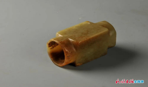 玉器被喻為王者之器,象征著權(quán)力、地位與財富,因為數(shù)量稀少而顯得尤為珍貴。該展廳有一枚白玉琮,內(nèi)圓外方,四邊呈橫長方形,兩端出射,射口呈圓形,中心有一對穿圓孔,孔壁平直。琮體切割規(guī)整、厚薄均勻、邊角端正、輪廓分明,無論是其材質(zhì)還是做工,都堪稱完美,是齊家文化玉器的代表之作,也是齊家先民原始宗教觀念的體現(xiàn)。“古人認為天是圓的,地是方的,所以制作出這種玉琮來祭祀天地,與天地溝通。”馬蘭介紹道。