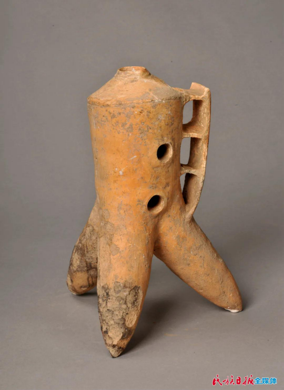 除了玉器,這里還展出了齊家文化最具代表性的器物——陶器。其中一件叫三足盉,是齊家陶器的代表性器物。這件展品問世后,因結(jié)構(gòu)巧妙、制作精良、年代久遠且保存非常完整,引起了國際上的關(guān)注,獲得世界各國專家學(xué)者的一致好評。