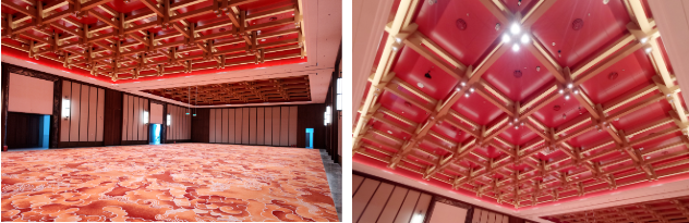 宴會(huì)廳天花的設(shè)計(jì)借鑒宋式屋架結(jié)構(gòu),通過(guò)現(xiàn)代設(shè)計(jì)手法進(jìn)行簡(jiǎn)化概括形成符合現(xiàn)代人審美的造型裝置藝術(shù)。