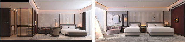 客房區(qū)域的設(shè)計(jì)以“畫屏”借助宋代屏風(fēng)的藝術(shù)形態(tài),通過(guò)提取、拆解、重構(gòu),以中國(guó)傳統(tǒng)繪畫留白的手法契合現(xiàn)代年輕人的審美。