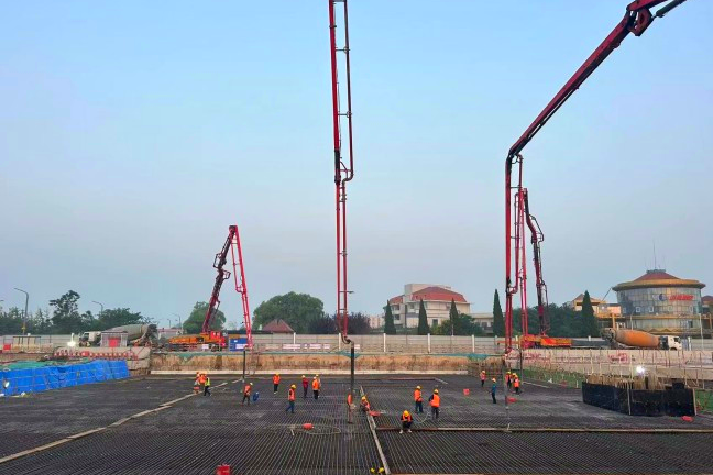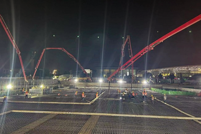 本次澆筑從9月6日22時開始,歷時30小時,4臺泵車聯(lián)合作戰(zhàn),順利澆筑完成3800立方米混凝土。為完成施工區(qū)域道路導改及管線遷改,臨八路人防頂板先行施工,人防蓋板由鋼管柱支撐,長度49米,寬度73.5米,蓋板下主體結構及土方施工采用蓋挖法施工,結構主體采用C45P8抗?jié)B混凝土。