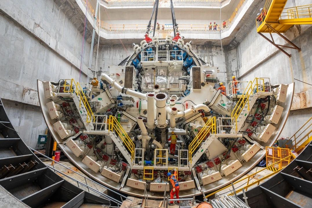 工程所采用的“山河號”盾構機,是世界在建最大直徑泥水平衡盾構機,最大開挖直徑17.5米,總長163米、重達5200噸、裝機總功率12580千瓦,裝配各類刀具306把,其中57把可實現滾刀齒刀互換,刀盤開口率53%,最大限度滿足掘進所面對的復雜地層,盾構機總裝達到世界先進水平。