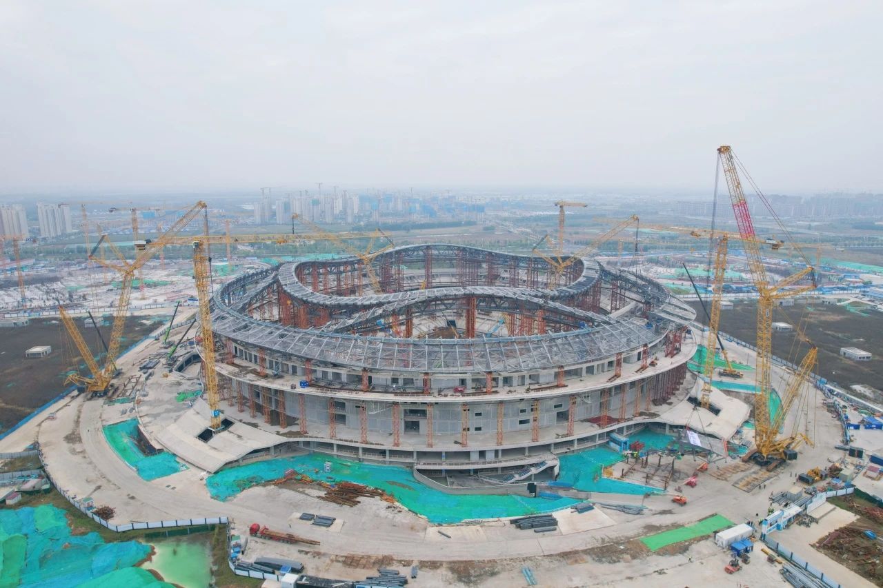 項目鋼結構施工擁有多項國內之最,屋蓋鋼結構最大懸挑長45米,是國內體育場館懸挑長度之最;施工跨越夏秋冬三季,溫度變化會形成巨大誤差,累積合龍段施工難度為目前國內之最;鋼結構拼裝完成后,需要將支撐胎架進行分級卸載,卸載過程中產生的變形量是國內同類場館之最。