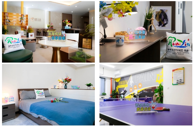 區(qū)別于普通出租公寓、酒店賓館,根據(jù)青年喜好,植入專屬LOGO 、IP形象等青春元素。房間內(nèi)部配備床、衣柜、書桌椅、置物架等,并有獨(dú)立衛(wèi)浴、冷暖供應(yīng),青年可“拎包入住”。公共區(qū)域整體打造自助辦公、學(xué)習(xí)閱讀、運(yùn)動(dòng)健身、共享會(huì)客、休閑娛樂、自助廚房6大功能區(qū),滿足青年日常需求。