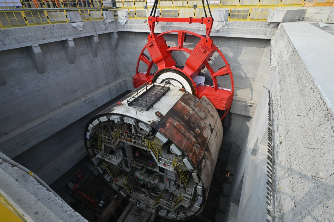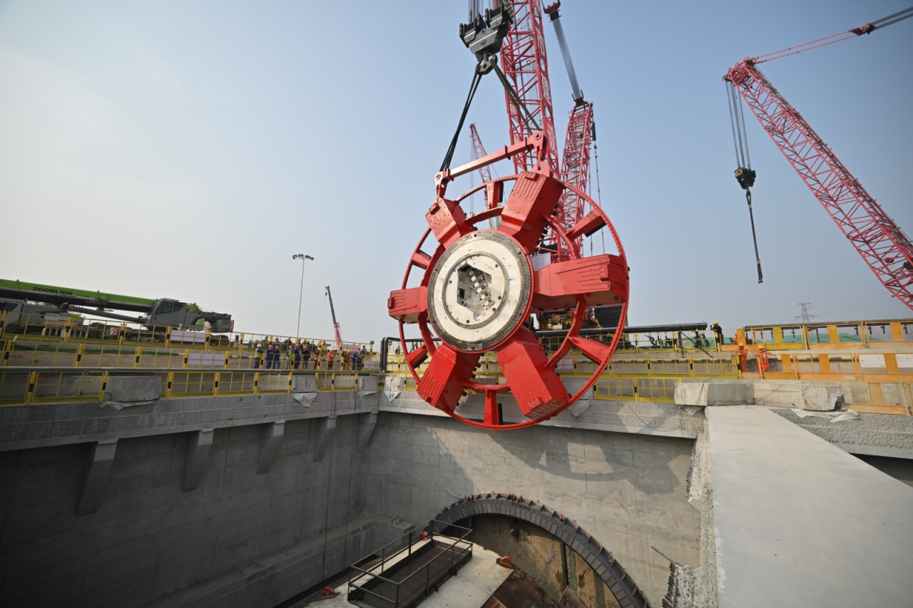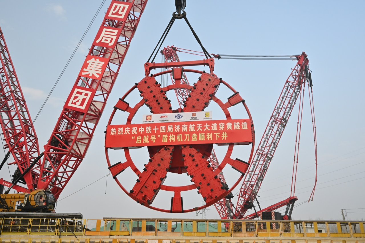 3月1日,直徑15.06米的超大直徑盾構(gòu)機(jī)“啟航號(hào)”刀盤在兩臺(tái)履帶吊助力下完成“空中轉(zhuǎn)體”后緩緩下井,與盾構(gòu)機(jī)精準(zhǔn)“合體”,標(biāo)志著由濟(jì)南城市建設(shè)集團(tuán)投資建設(shè)、中鐵十四局集團(tuán)承建的濟(jì)南市航天大道穿黃隧道盾構(gòu)機(jī)主機(jī)基本組裝完成,即將進(jìn)入調(diào)試階段。